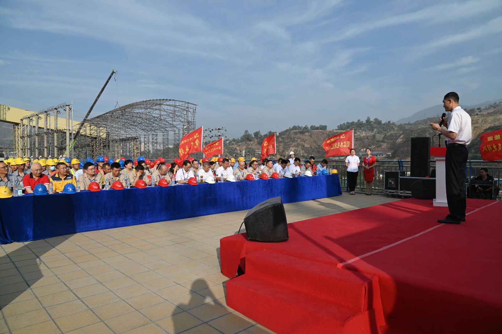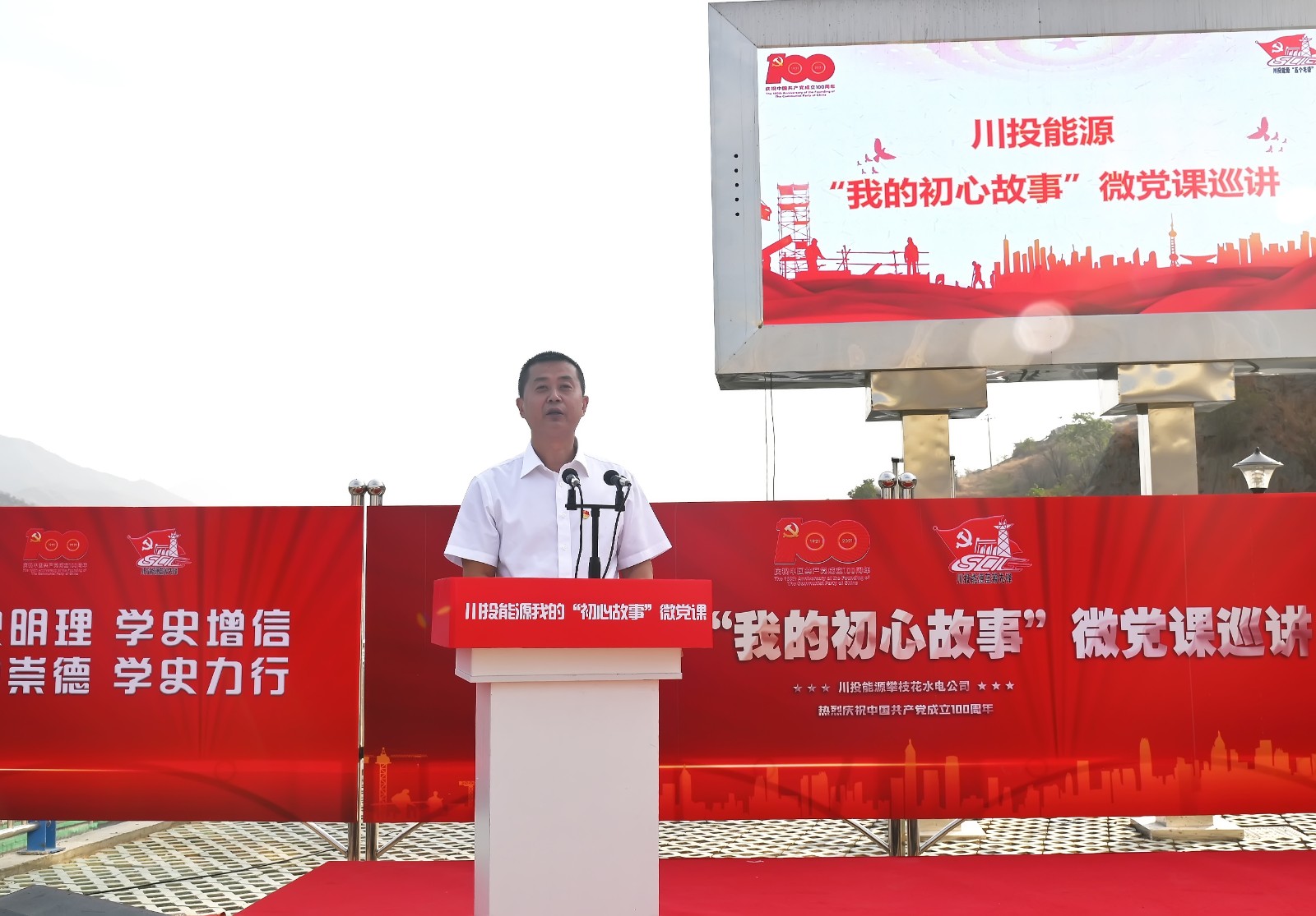 5月19日上午,川投能源“我的初心故事”微黨課巡講團首站來到銀江水電站工地現(xiàn)場,為攀水電及各參建單位黨員代表100余人帶來了一場紅色勵志的“視聽盛宴”。公司黨委書記、副董事長、總經(jīng)理楊洪,黨委副書記、工會主席楊超龍,副總經(jīng)理、攀水電公司黨總支書記、董事長徐孝剛及各參建單位負責(zé)人參加現(xiàn)場巡講。